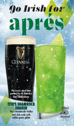 Using readily available inventory and sales data to determine guest preferences, Sodexo Live! conceived and implemented a limited-edition St. Patrick's Day bar menu available from March 17 to 19, 2023. Lucky guests could enjoy Tito’s Shamrock Shakers, an original cocktail crafted using Tito’s Handmade Vodka, club soda, and festive edible green glitter, and Guinness, the classic drink of choice for St. Paddy’s Day.